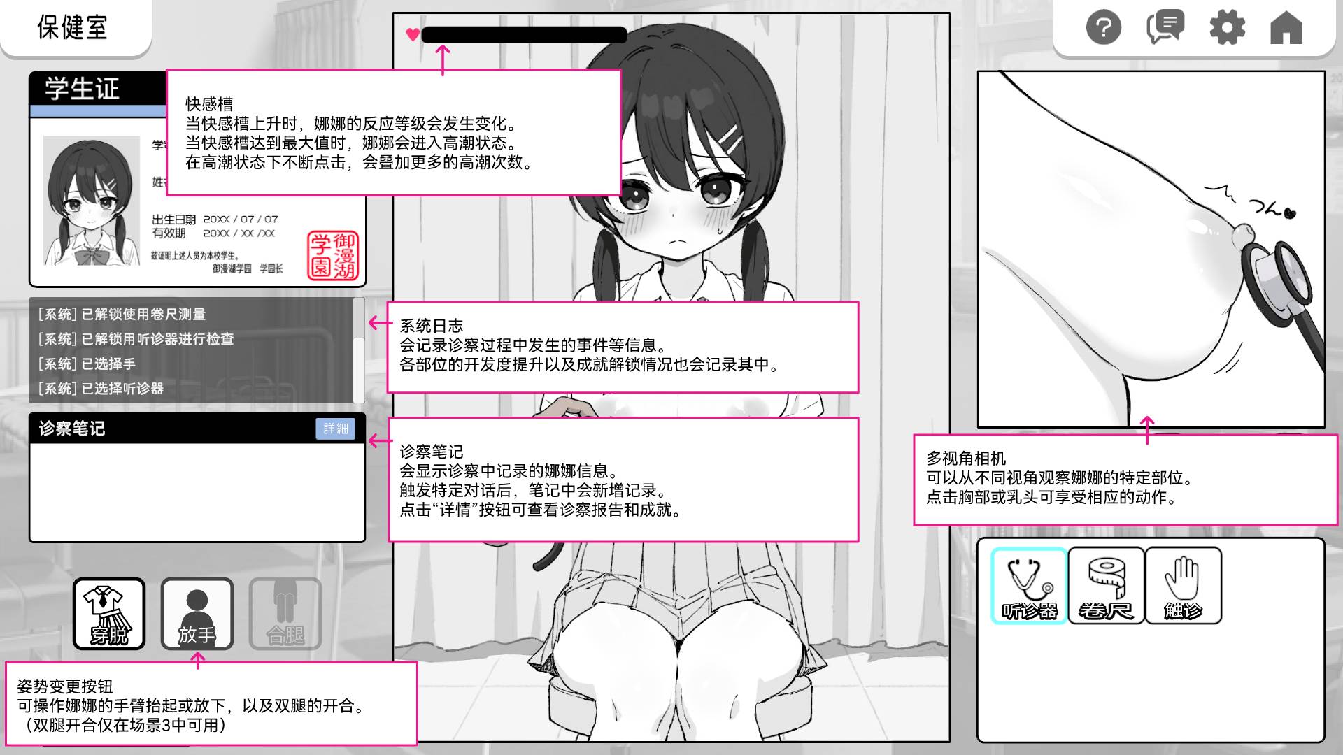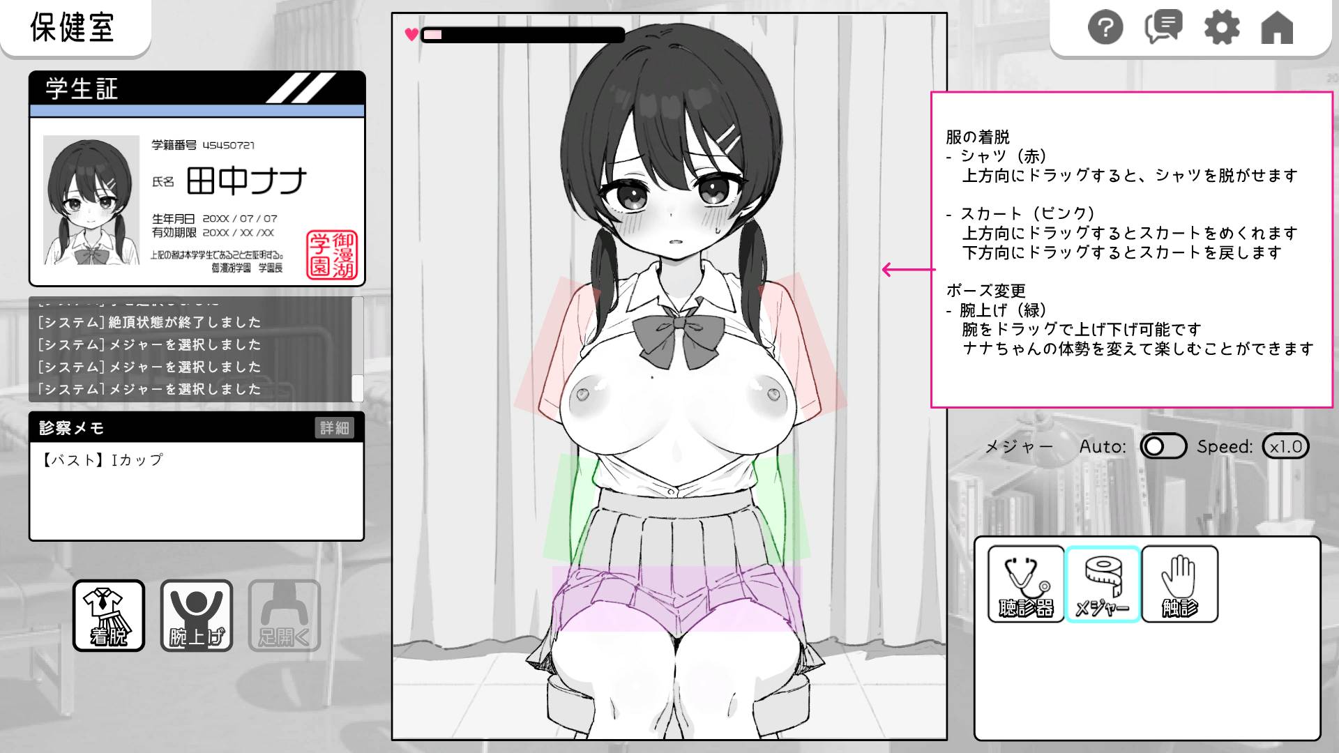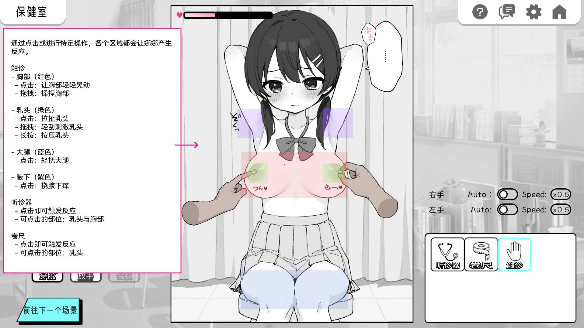 這是一款令人尷尬的觸摸遊戲,你可以以「健康檢查」為幌子,觸摸一個整潔、嚴肅、擁有巨乳的女孩的每一寸肌膚。